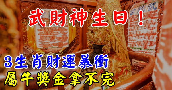 今天5月4日(農曆3月15日)為武財神趙公明的誕辰,《生肖星座運勢命理玄學》運勢專欄指出,生肖牛、雞、狗在武財神誕辰後財運將爆棚,事業上能有好表現賺到錢財外,投資方面只要把握機會將可獲得回報,其中生肖牛正、偏財運都有賺頭,可好好把握。