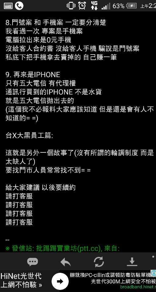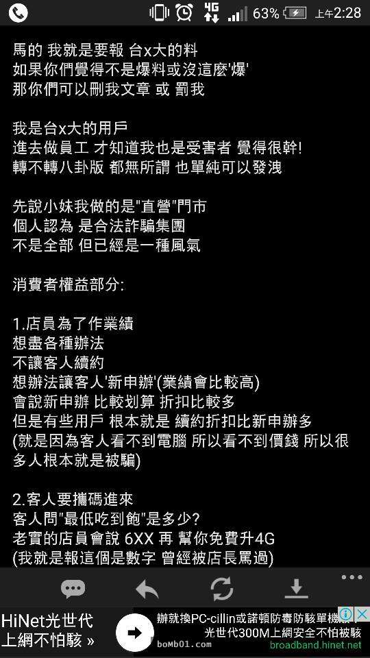 這位前員工在PTT上發文爆料,表示自己原本是台X大的用戶,後來到直營門市當員工,才知道很多黑暗的內幕…