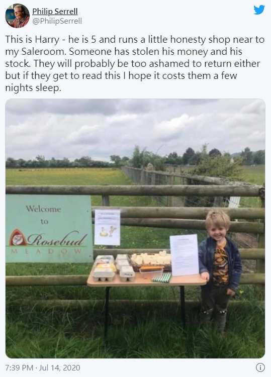 這件事被一位名叫菲利浦(Philip Serrell)的拍賣商分享到推特上,許多網友都很心疼小哈利,並表示希望能盡自己一己之力讓誠實商店再度恢復營業。