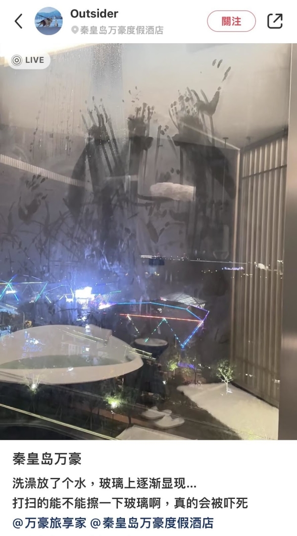 網友Outsider在小紅書發文抱怨,洗澡放了個水,沒想到玻璃上逐漸顯現一個又一個掌印,讓他崩潰直呼「打掃的能不能擦一下玻璃啊,真的會被嚇使欸」。