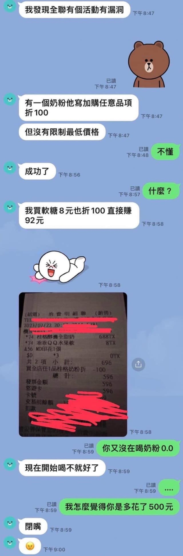 一名男網友在臉書「我愛全聯-好物老實説」PO出和女友對話,只見女友興奮表示,發現全聯活動有Bug,接著就分享有一款奶粉正推出促銷活動,搭配任意品項購買就現折100元,由於該活動未限制搭配品項的最低價格,因此她就選了一款8元的軟糖,讓她自覺「直接賺了92元」。