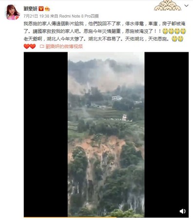 劉樂妍在微博發文:「我恩施的家人傳這個影片給我,他們說回不了家,停水停電,車庫,房子都被淹了。請國家救救我的家人吧。恩施今年災情嚴重,恩施被淹沒了!」
