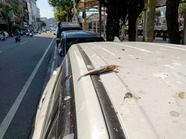 基隆市田寮河美猴橋、金雞橋間仁一路旁行道樹如鷺鷥林,有人在樹下違停遭,除遭排泄物「轟炸」彈痕累累,樹上竟還「下魚」掉落在車頂。記者邱瑞杰/攝影