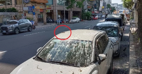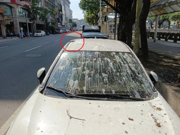 其中有輛白色車因為停放時間較長,車身滿是鳥屎,前擋風玻璃有數十處「彈著點」,排泄物流瀉,有人形容像夜空煙火,也有人說是潑墨畫。