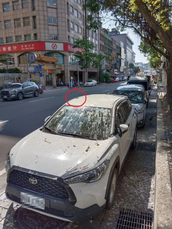 基隆市田寮河美猴橋、金雞橋間仁一路旁行道樹如鷺鷥林,有人在樹下違停遭,除遭排泄物「轟炸」彈痕累累,樹上竟還「下魚」掉落在車頂(紅圈處)。記者邱瑞杰/攝影