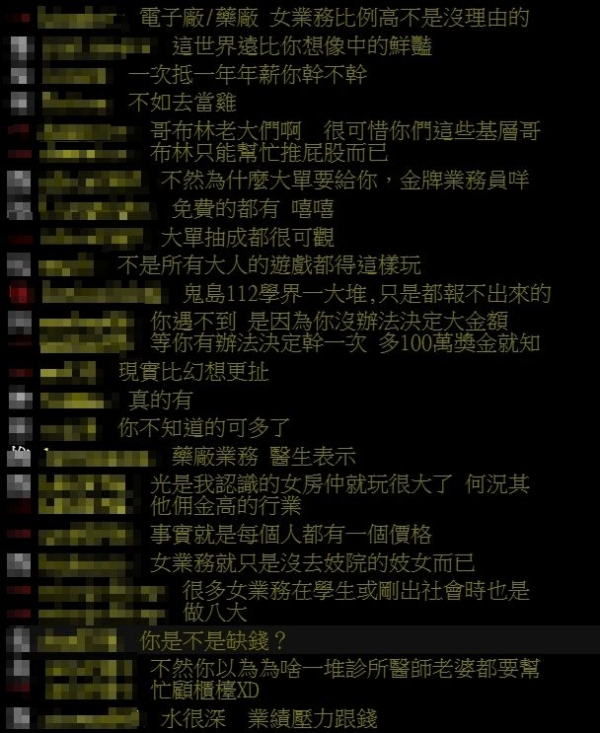 有知情人士則透露,「醫院超多」、「電子廠/藥廠的女業務比例高不是沒理由的」、「超多,遇過很多女業務為了訂單不擇手段」、「醫院真的不少」、「藥廠女業務跟醫師的新聞還不夠多嗎」、「藥廠一堆」、「你要不要聽聽藥廠業務和醫生的故事?基本上藥廠很多女業務」。