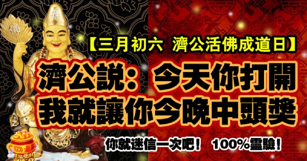 【三月初六,濟公活佛成道日】濟公說:今天你打開,就讓你今晚中頭獎,你就迷信一次吧!100%靈驗!